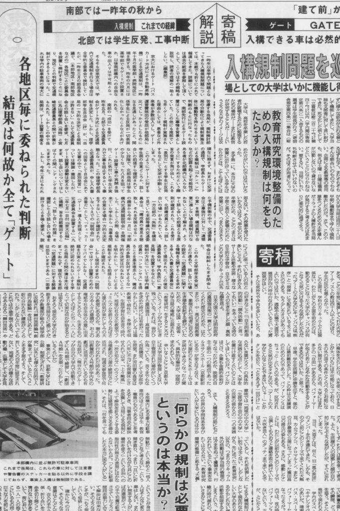 は 先輩がサクサク進めていた印象。構成力のある人だったから、大学全体を見てネタを探してきて、何面に何を置くというのがすぐに決まった。記事のネタはいろいろあった。車両の入構を規制するゲート(※8)ができたころで、今に通じる管理強化が進んだ時代だった。一方で、西部構内は、西部講堂でライブが行われたりして自由な雰囲気だった。ぬかるんだ西部広場に、印刷所から持ち帰った新聞を車で運び入れるのは、運転のいい練習になったな。大阪の福島に印刷所があって、そこは印刷費が安かった。当時は電算写植。ワープロで原稿を作って、フロッピーディスクに保存して持って行くとゲラを用意してもらえて、それをチェックする。写真を載せるときは、フィルムカメラで撮って、白黒掲載用のドット画像にするためにスキャナーで読み込んで現像してもらう。けっこうお金がかかった。