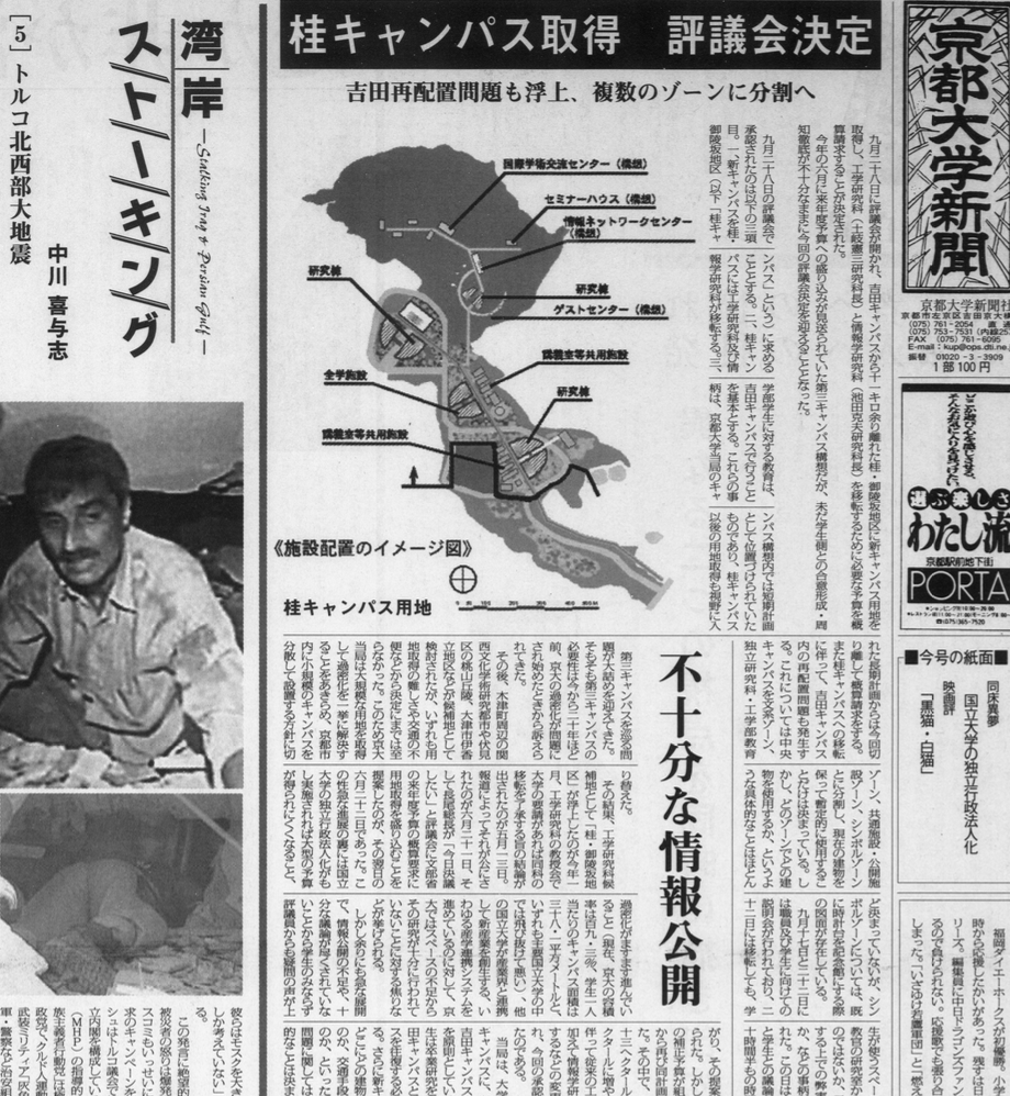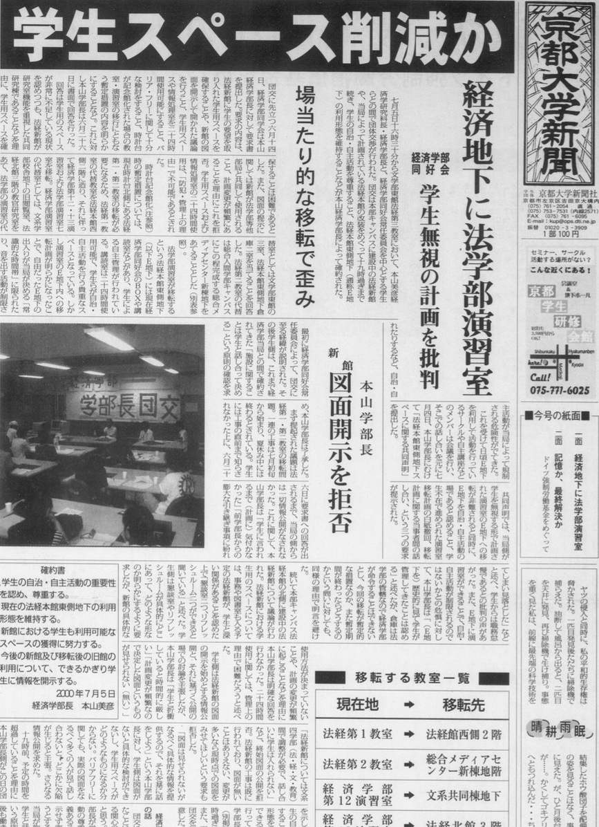 新聞社▼京大新聞主催講演会「移植医療が死をつくる~狙われるあなたの臓器~」 時事▼TOPIC:東山通で電線地中化▼インタビュー・吉岡斉氏:民主的な科学技術政策→「外に開かれた政策論争を」▼記憶か、最終解決か:ドイツ強制労働補償基金/文3回生寄稿▼新連載・京大のゴミはどこへいく:自家処理の意義と困難→環境保全センター教授インタビュー▼大川興業総裁インタビュー→「バカ」のできるやつになれ▼卒業者就職先一覧 教育研究▼ネットで休講情報、全学共通科目のみ運用▼医・入試改革、生物が必修へ▼京大病院、3例目のドミノ肝移植:慶応大学病院と協力▼工・院試にTOEIC:導入課程に疑問▼新入生歓迎教官インタビュー:高月紘教授→「学生は環境にやさしくない」/新宮一成教授→「病んだ精神も統合した人間像を」▼人文研改組へ:5大部門制へ再編▼生態研で死亡事故:求められる安全対策→メキシコで9名を載せたボートが転覆、2教授が死亡、1助教授が行方不明▼全学共通科目、朝鮮語講座を開講:5学部で卒業単位算入▼総合人間学部が見解:独法化への懸念強く→「よりよい姿探る出発点に」▼総人、教官が学生宅を訪問:保護者から学部宛に子の安否尋ねる手紙→授業出ず単位ほぼ未取得が判明▼退官教員インタビュー:生態学研・田端英雄助教授→林業で里山を取り戻したい/柴田光蔵教授→ローマ法から現代を斬る▼複眼時評:フィールドワークの醍醐味/山極壽一氏→満喫するには、自己管理能力・観察能力・記録能力・考える能力・語る能力が不可欠▼インタビュー・小田実さん:戦争主義から平和主義の世界へ 大学運営▼時計台2階に「日の丸」揚がる:学生は監視継続→皇太后崩御に際して通知、宮崎副学長「(政府・文部省と)いらんけんかはしたくない」▼ホントに木を切る気?:総人のメタセコイア、伐採の危機▼医・職員、寄付など3千万横領で逮捕▼運営諮問会議が発足▼学生スペース削減か・経済地下に法・演習室:経・同好会、学生無視の計画を批判→学部長、図面開示を拒否▼京大助手が中学生へのわいせつで逮捕→警察入構の際は全学自治会同学会が立ち会うが、今回は連絡が直前で同行せず▼京大病院、医療ミスで患者死亡:問われる管理体制→人工呼吸の加温加湿器に誤って消毒用エタノール▼工・教授が出張費を二重受給:5年で35万円▼桂キャンパス03年移転開始:来年より建設着工、他分野との交流重視→赤岡副学長に課題を問う/地元の反応「全面的に歓迎」も環境・騒音に不安▼事務局移転問題、新管理棟計画浮上:学生立入を大幅制限▼大学コンソーシアム京都、京大も加盟へ:他大学との単位互換や社会人向け講座は行わず▼民族学校出身受験資格、学部受験認めず:公開質問状・総長、事実上回答を拒否 学生▼NF講演会特集→本格ミステリの魅惑(綾辻行人氏)/動物行動学の現在/実名報道/正義とケア▼インタビュー・京大医学部卒のプロボクサー「若いうちの苦労は買ってでもしろ」▼サークル特集→相撲部/フェンシング部/ESS/環境ネットワーク4Rの会/アニメーション同好会ほか▼京大におけるセクハラ防止パンフ→あいまいな責任の所在▼新入生アンケート:入学理由「学風が合いそう」30%▼大学生入門→競馬:お金をスッてなんぼ/家庭教師:勉強3割に子守りが7割?▼同棲白書:カップルの1日に編集員が密着/「一緒にいるのが自然」「結婚しか考えられない」▼ここでしか学べなかったもの→元寮生の京都市職員が語る▼山仕事サークル・杉良太郎▼祭りを学生の手に:北部祭 文化▼展覧会・京大俳句の光芒:困難な時代に自由求めて▼本紹介「キャンパス・セクハラ」▼免許を取ったらアウトレットへ!:ミレニアム教習所体験▼書評:『戦闘美少女の精神分析』『世俗宗教としてのナチズム』