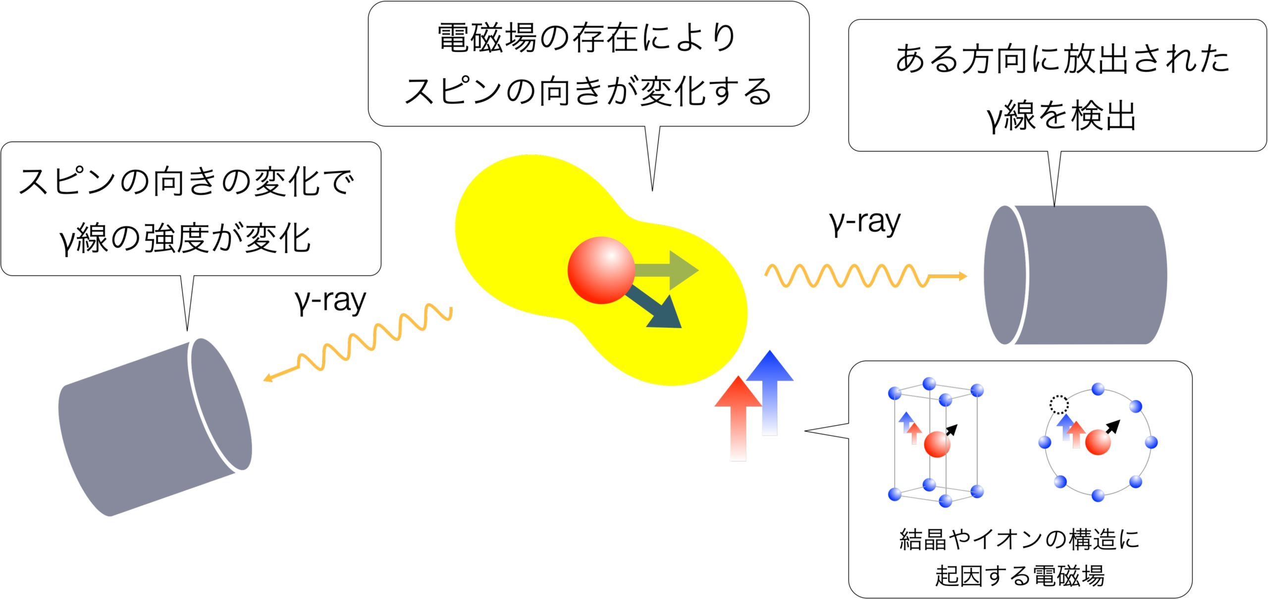 周囲の電子や原子核の作る電磁場の影響で原子核のスピンの向きが変わると、γ線の放出に変化が現れます。この変化を検出することで、不安定核の周りの電子構造など物質内部の状態を調べることができます。